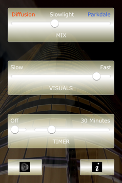 I don’t hide the fact that although I’ve been writing about ambient music for more than a decade, I cannot for the life of me create the stuff. Seriously, you sit me down at a synthesizer and tell me to make music, and I’d probably put an eye out. But with the latest offering from dreamSTATE, I can dabble a bit. Ephemeral City is a mix of album and app, a set of infinite loops controlled by a slider that allows you to balance the mix and flow between three soundsets at a time. The soundsets change across time, and always offer light, “medium” (for lack of a better word) and dark apsects. For example, at one point you can alter the flow of Alley/Slowlight/Bassilica, then look again to find you’re mixing Cantus/Slowlight/Roller. Once you’ve set yourself a flow, tap the screen and watch morphing cityscape photos from ScottM2. Ephemeral City also lets you set the speed at which the visuals change, and a timer will tell it to turn off anywhere from 15 minutes to 8 hours after you start.